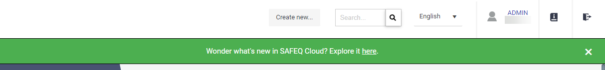 Whenever SAFEQ Cloud is updated to a new version, the notification with a link to the release notes appears at the top of the SAFEQ Cloud Web UI. It will be displayed until you close it manually. You will only see these notifications if you have the ViewNewReleaseNotification permission.