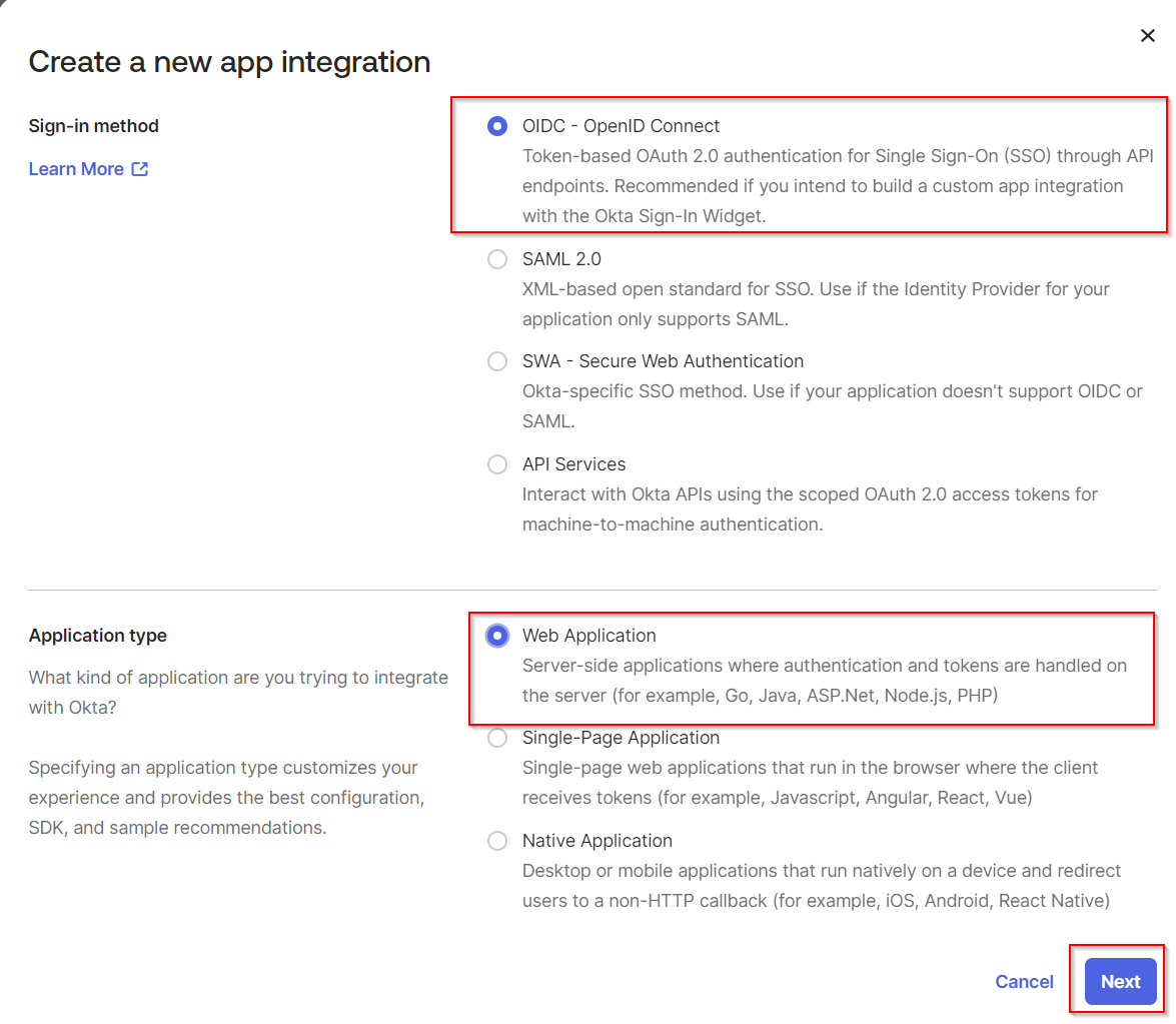 Select OIDC - OpenID Connect. In Application type, choose Web Application. Click Next.