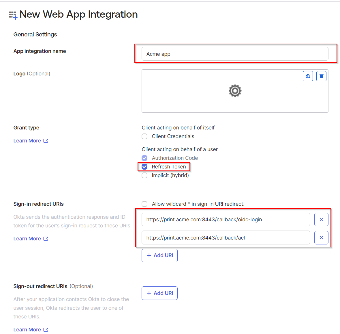 Enter the name of your new application. In Grant type, select Refresh Token (apart from Authorization Code which is selected by default). In Sign-in redirect URIs, add two URIs: