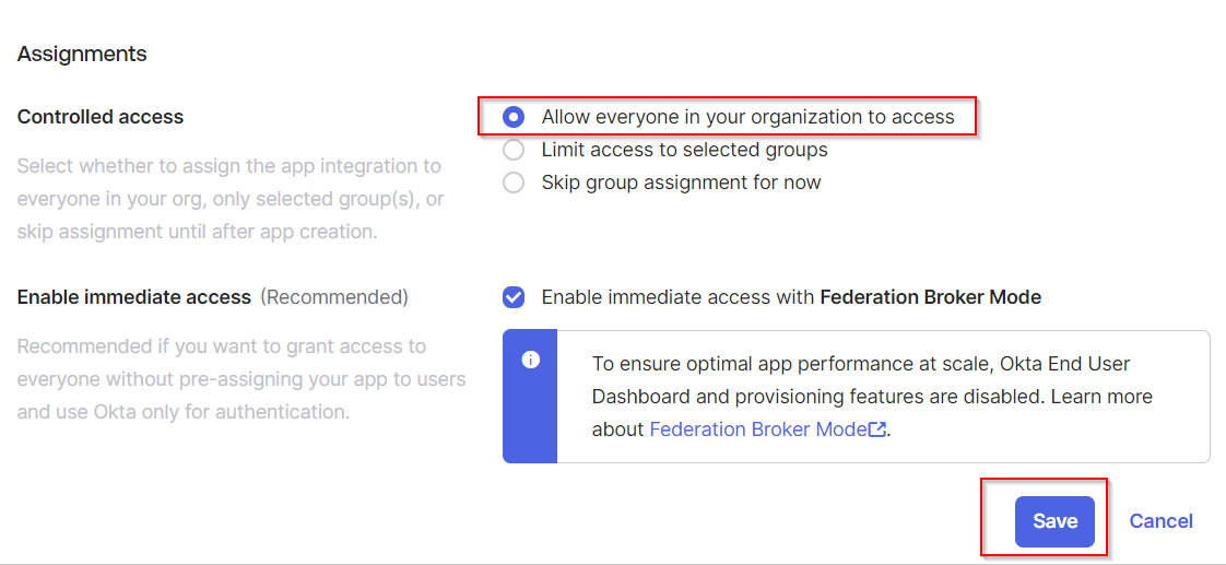 On the same page, in Assignments > Controlled access, select an option that suits your company policy the most. The default is Allow everyone in your organization to access. Click Save.