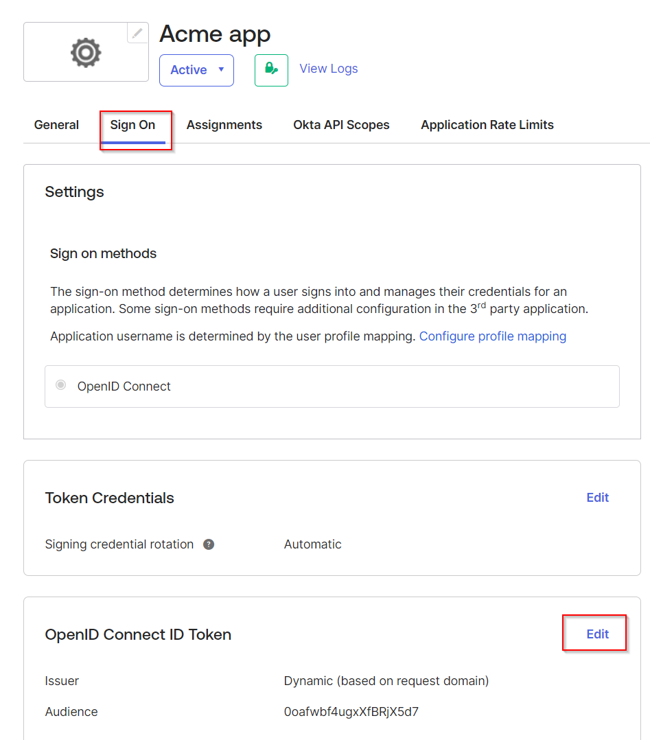 Your new application is now created. Navigate to Sign on tab go to the OpenID Connect Token section and click Edit.
