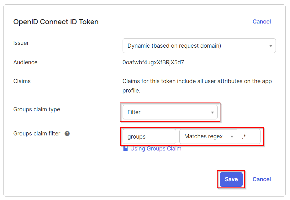 In Groups claim type, select Filter. In Groups claim filter, fill in "groups" and "Matches regex" and ".*" Click Save.