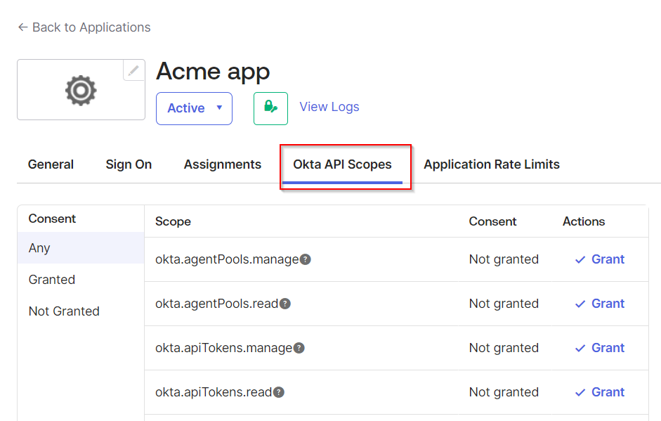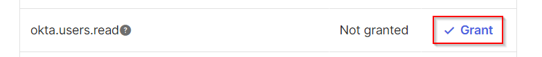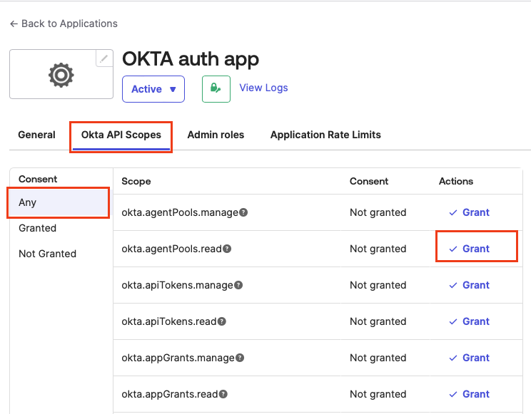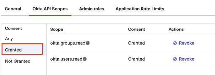 Got to the Okta API Scopes tab. Under Consent, click Any and search for okta.users.read and okta.groups.read. Select Grant for both.