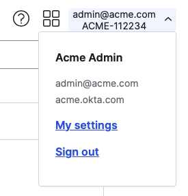 Save the value of your OKTA domain name. You can find it in the top right corner of the OKTA administration UI.