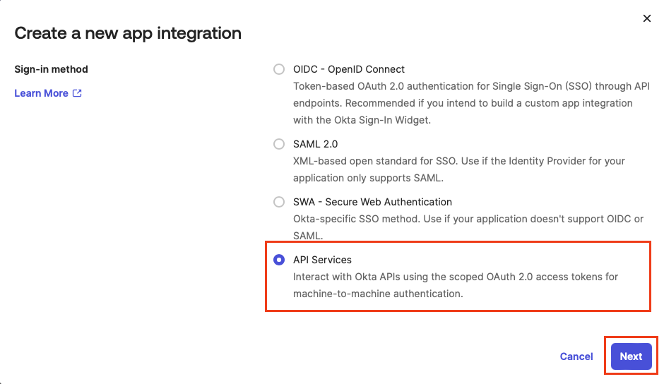 You can configure OKTA authentication to use either OpenID Connect (OIDC) authentication or Service account authentication (using native OKTA APIs), or both types at the same time. This combined type supports MFA.