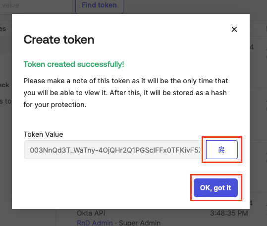 Copy the Token value. Save the secret value in a secure way. You will need it later on in SAFEQ Cloud Authentication provider configuration form. Click OK, got it to proceed.