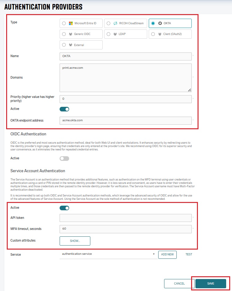 SAFEQ Cloud supports integration with OKTA identity management service for authenticating users, including multi-factor authentication (MFA). Additionally, SAFEQ Cloud supports OKTA’s LDAP interface service, see OKTA authentication via LDAP.