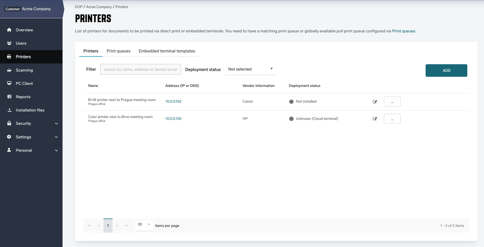 Client terminal service (Available when the ‘Gateway’ option is selected under ‘Connected to’. For the ‘Cloud’ option, this service is selected automatically.) - Select the Client terminal service from the drop-down list. If no service exists, you can add it by clicking Add. Client terminal service deploys embedded terminal clients running on MFDs, and the service with which MFDs communicate for authentication, retrieving job lists, and other purposes. The MFD will communicate to the selected service that may be deployed in the cloud or hosted locally on an edge device.