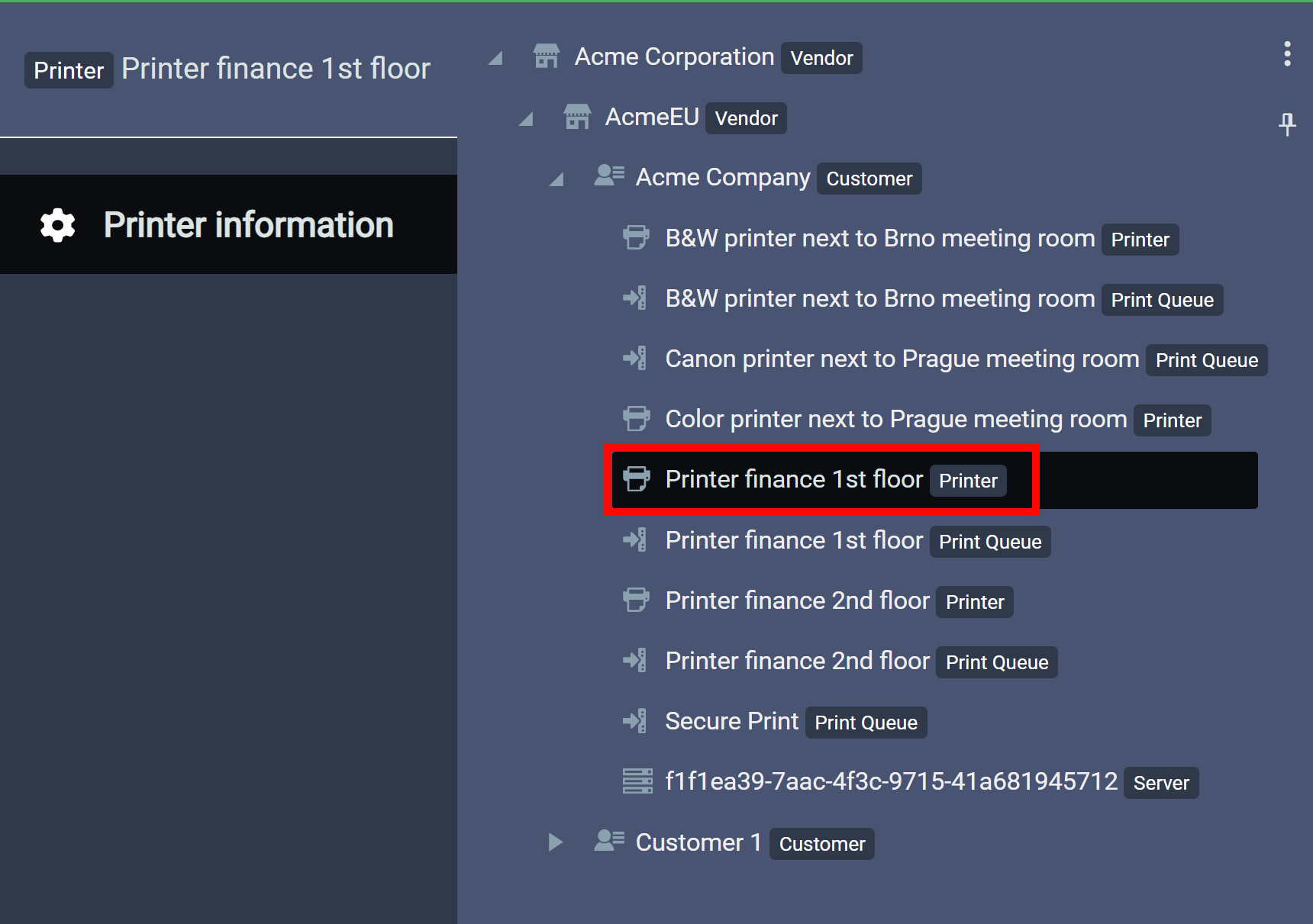 MFDs appear in the SAFEQ Cloud system tree as sub-nodes of the account. Selecting the MFD in the tree displays the sub-menu.