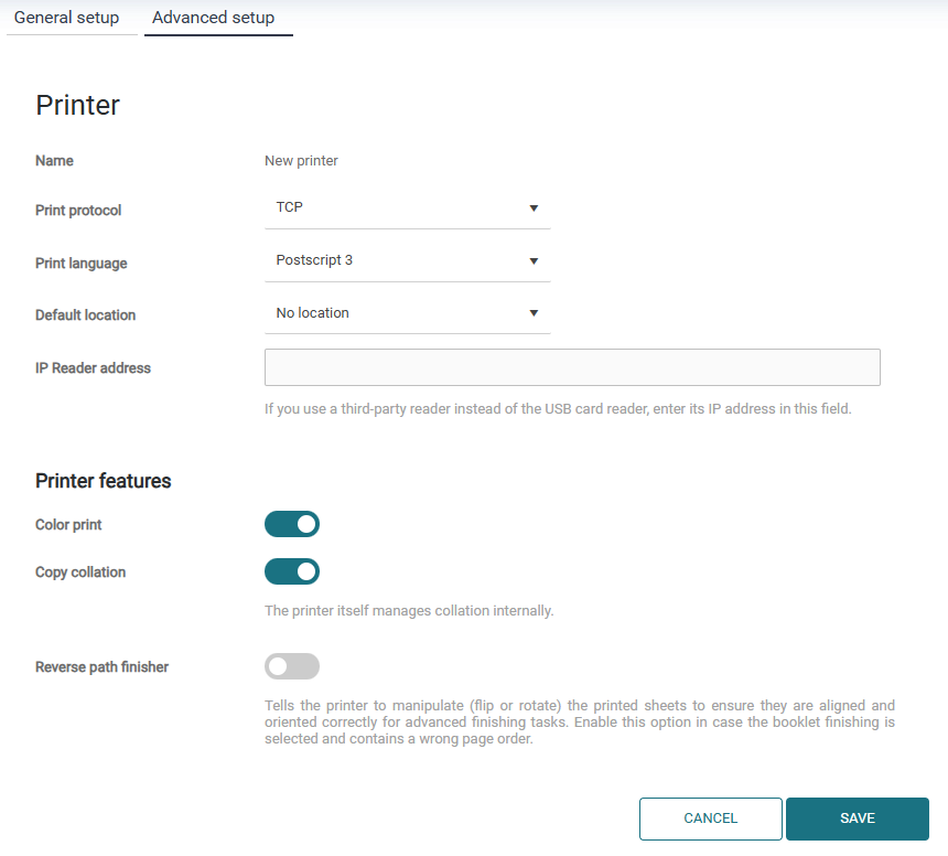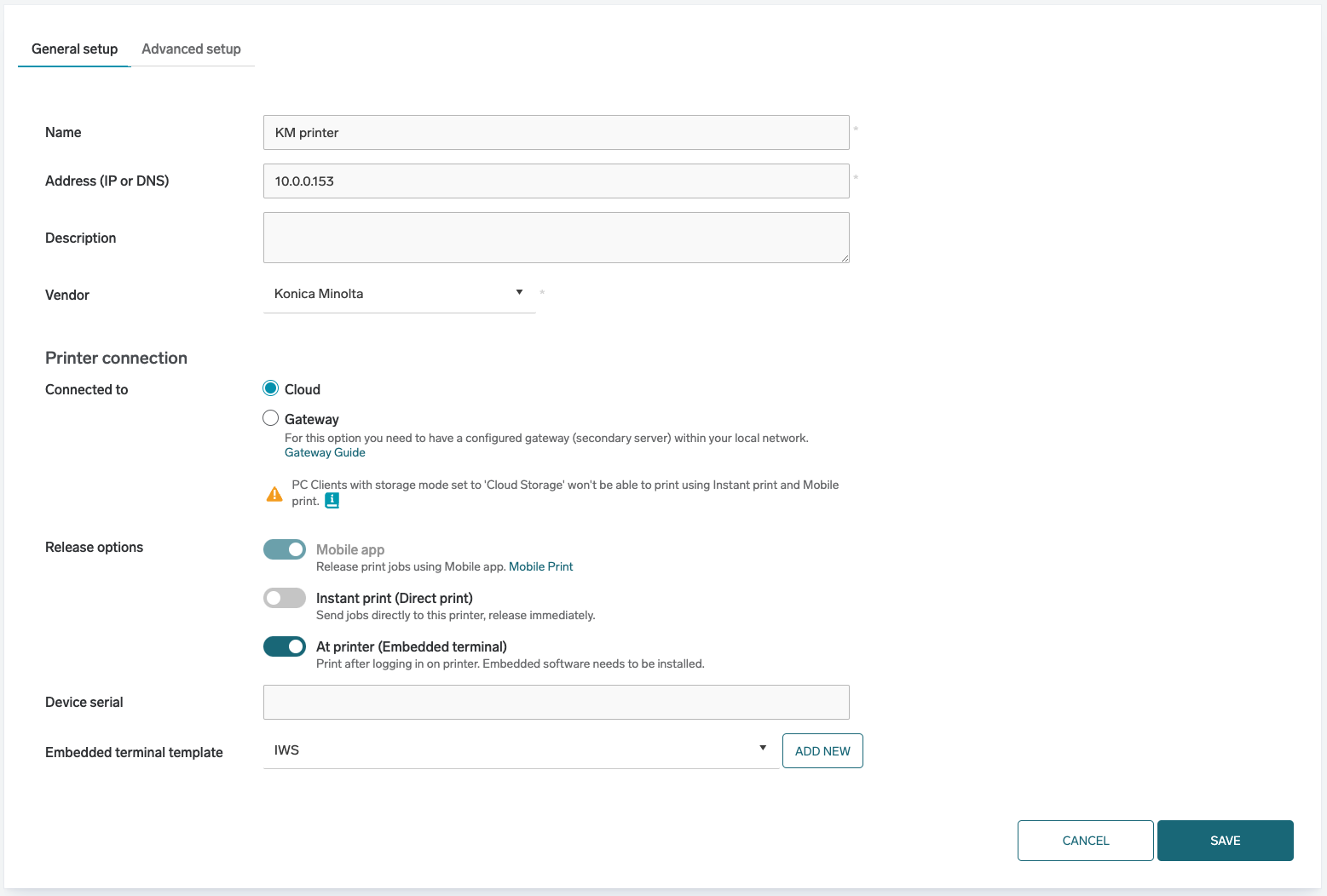 Following configuration is available when this option (At printer) is selected:Embedded terminal template – Select the embedded configuration from the drop-down list. If no embedded configuration exists, you can add it by clicking Add. In that case, a new dialog window will appear. For details on the available settings, see Embedded Terminals' configuration .