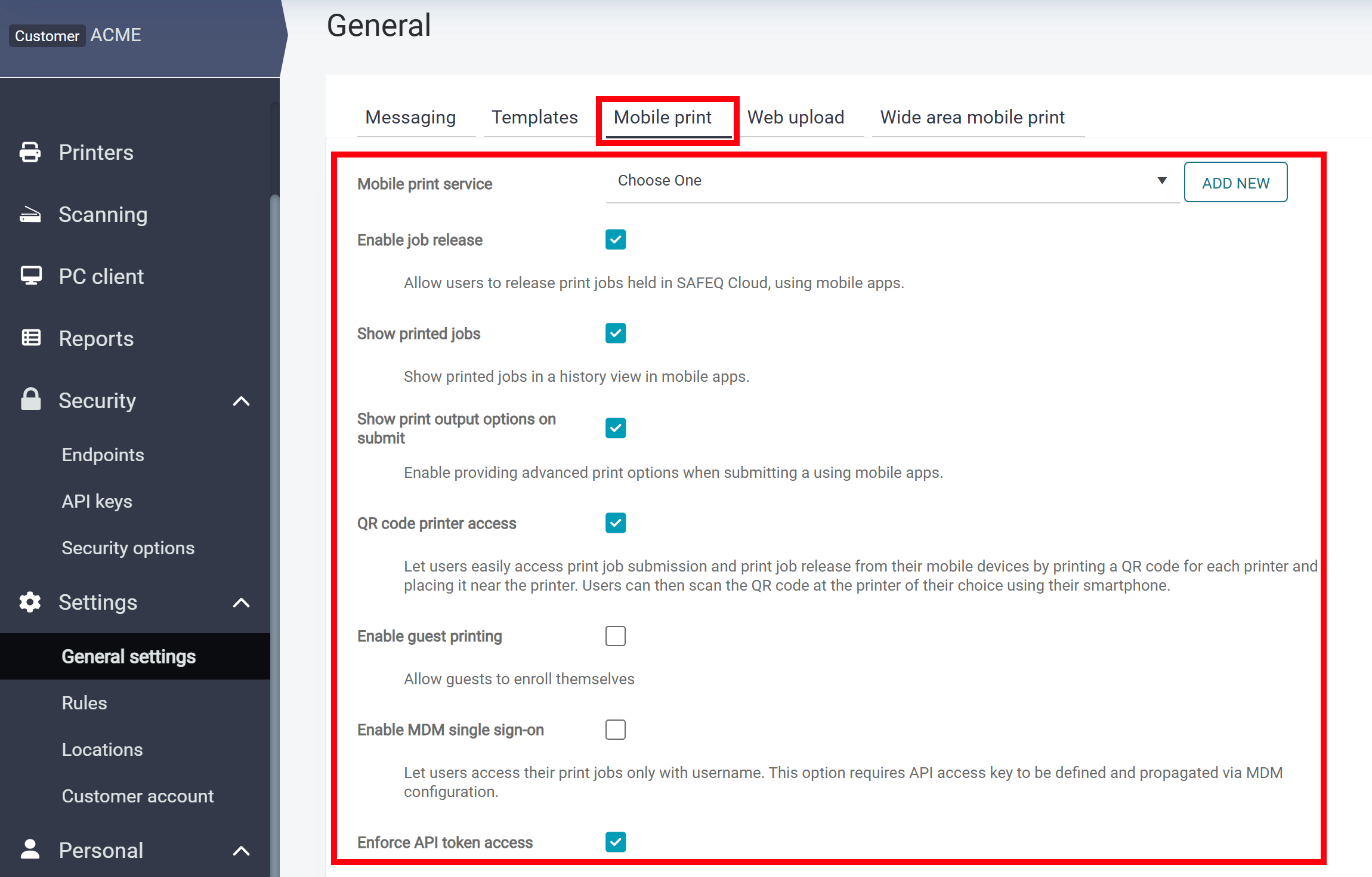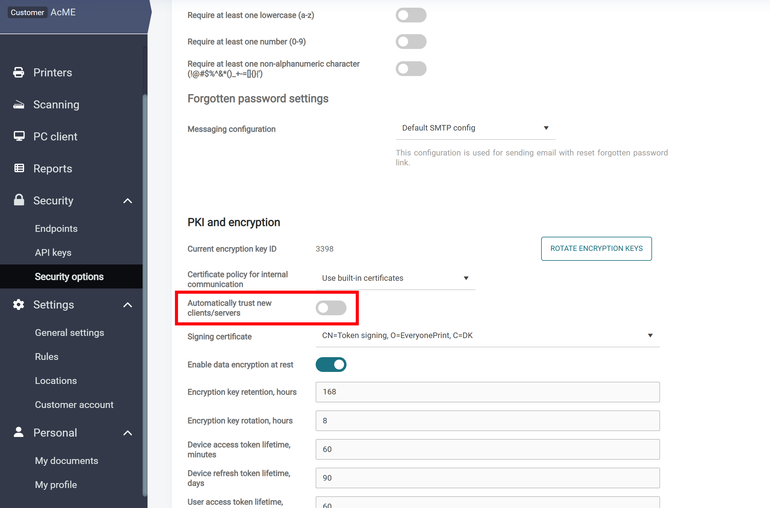 Note that if the option to Automatically trust new clients/servers is disabled in the PKI and encryption section under Security > Security options menu of SAFEQ Cloud Web UI, you will need to authorize each end user's SAFEQ Cloud Client in Security > Endpoints.