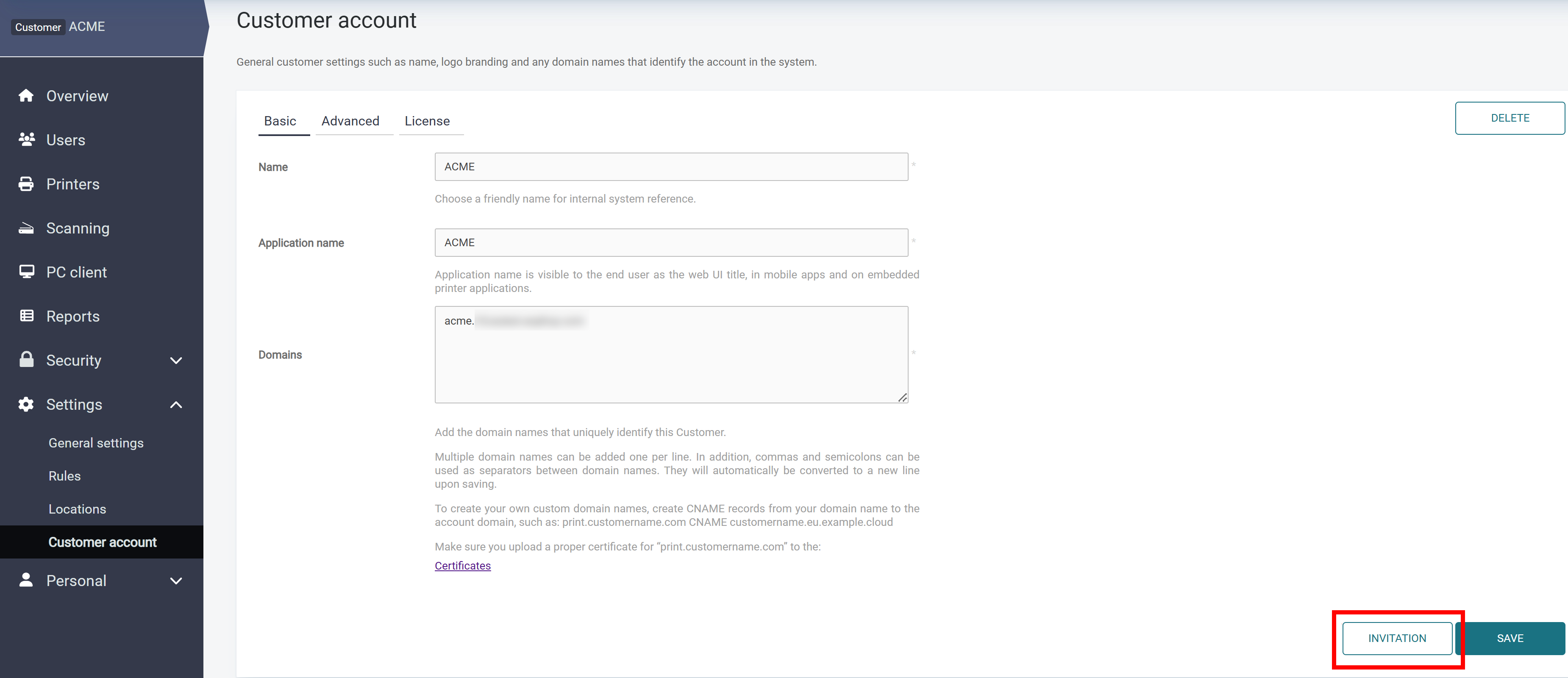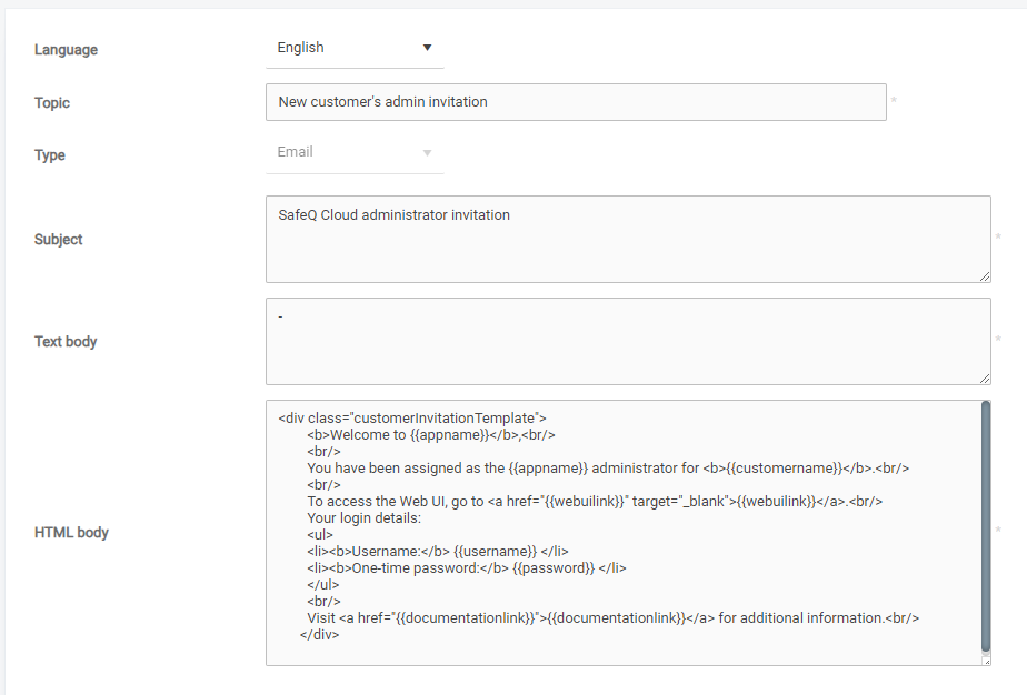 If you wish to edit the invitation message to the customer, go to Settings → General settings → Templates in your SAFEQ Cloud vendor account.
