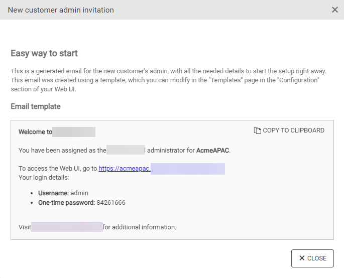 A window displaying a generated invitation to the customer admin will appear.