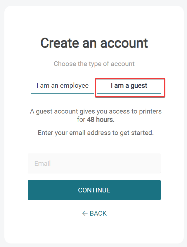 To register in SAFEQ Cloud as a guest, perform the below steps. A guest account in SAFEQ Cloud is meant for visitors, temporary employees, etc. It is a temporary account with more limited privileges than those of a standard user. The privileges and the expiration period depend on the settings done by the SAFEQ Cloud administrator.
