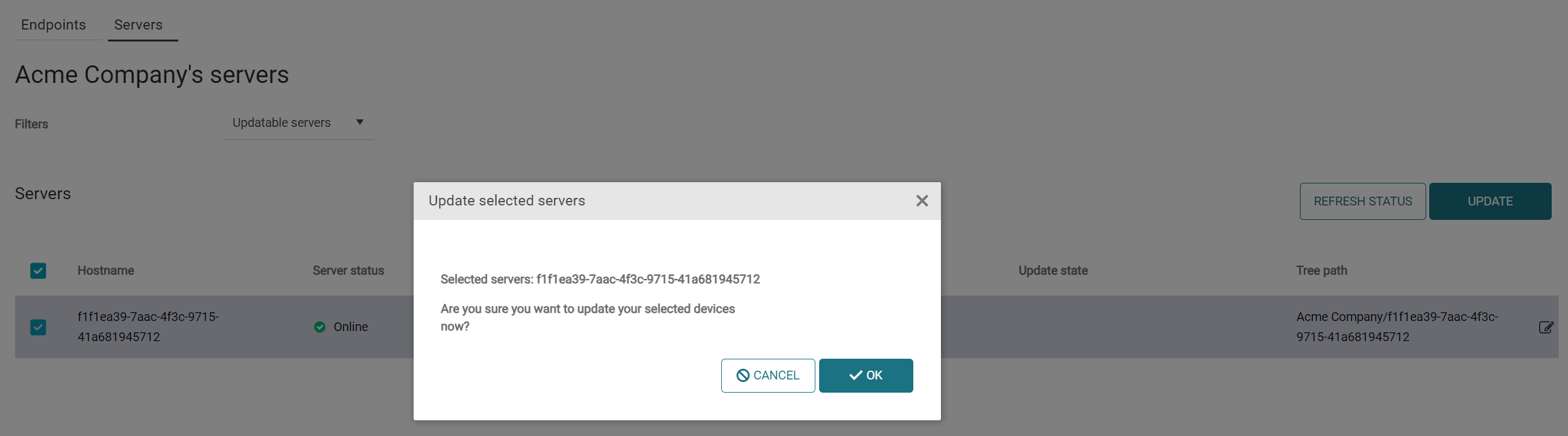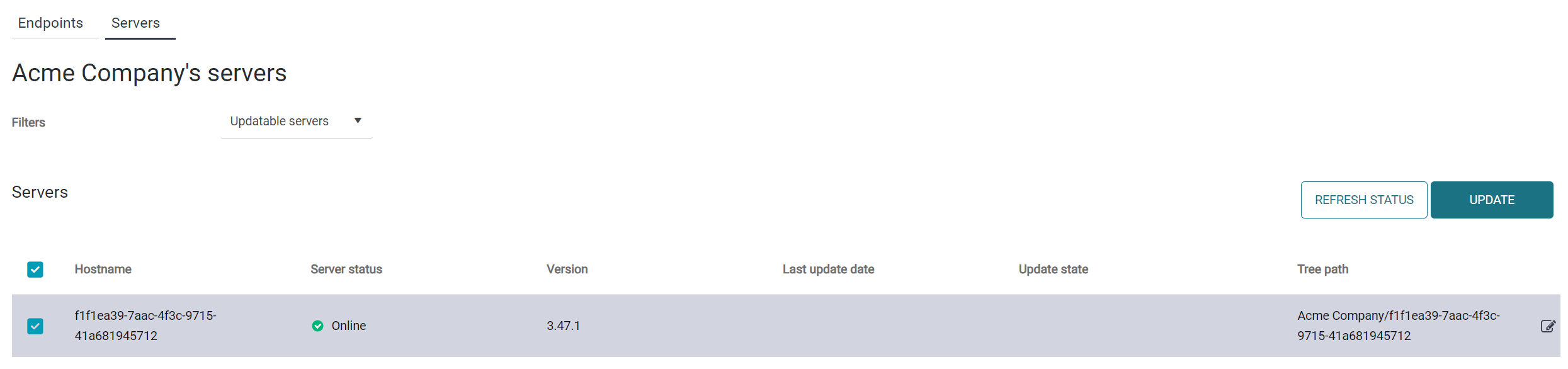 Update of the selected Secondary Gateways will start in the background. You can monitor the update status in the Update state column by clicking Refresh. It may happen that the Secondary Gateway will disappear from the list of updatable servers. In this case select All servers in Filters.