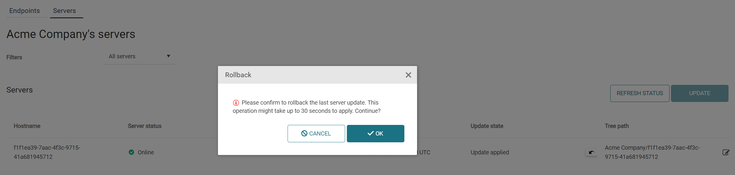 To perform the rollback, click the rollback icon in the server status column and click OK in the confirmation window:
