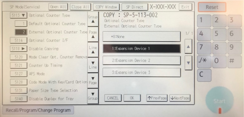 Then go to menu 5113 – Optional Counter Type and choose 2 – External optional Counter Type and then 1 – Expansion Device 1