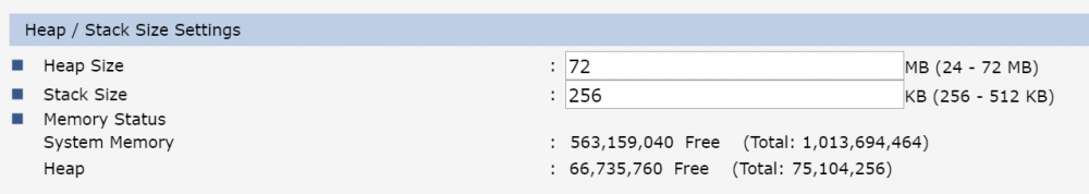 Confirm there are memory settings in Heap/Stack Size Settings section in the Heap Size and Stack Size fields. For example, it would look similar to as shown below which says “72” as Heap Size and shows heap in use etc. You can set Stack Size to 512.