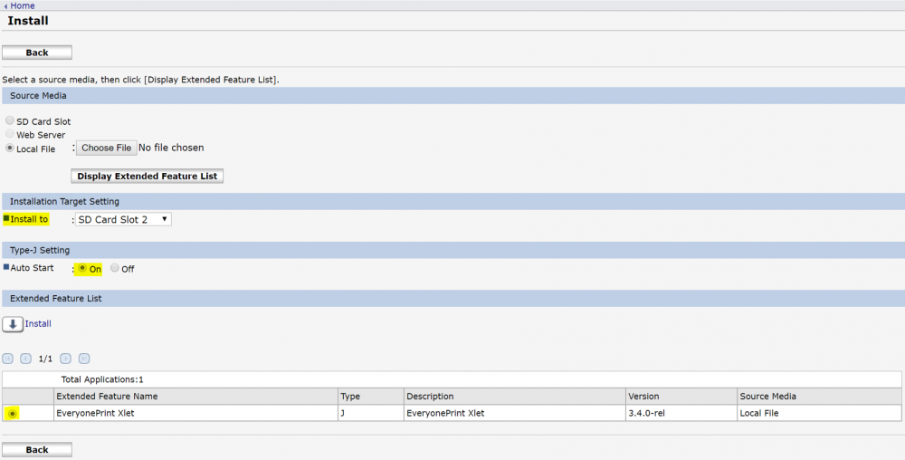 Ricoh Java SDK/J based embedded client can be installed from SAFEQ Cloud directly to the device where Java SDK/J is available on device by default. Follow steps in section Install Embedded on Ricoh devices from SAFEQ Cloud. For IMC devices, where Java SDK/J is not present by default, additional installation of SD card with Java SDK/J is required. For installation in this scenario, follow steps in section Sideload Java Embedded on Ricoh IMC Device.