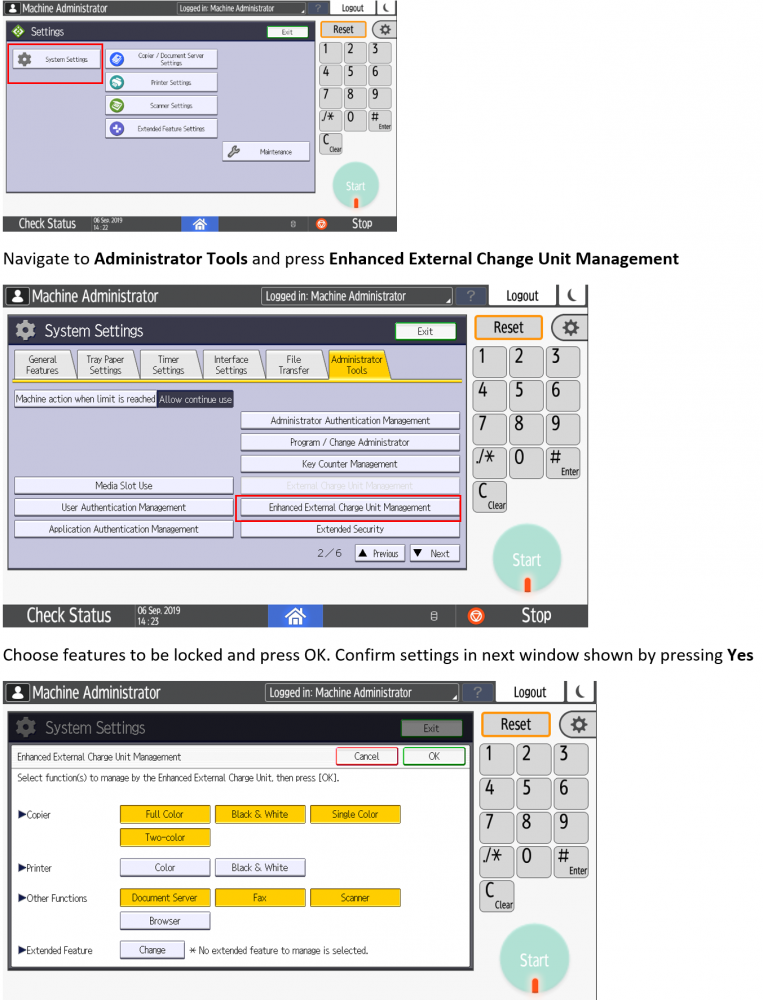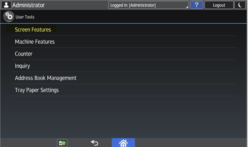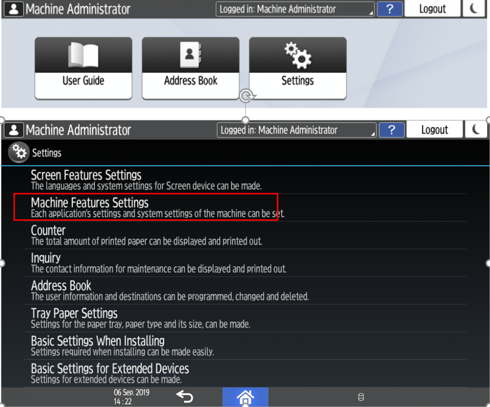 Login as machine administrator. Go to Settings > Machine Features Settings