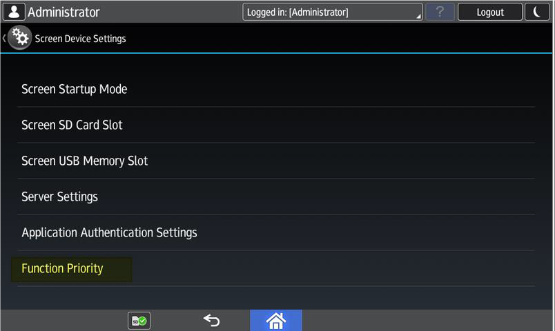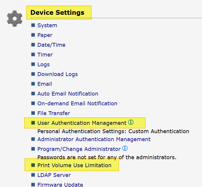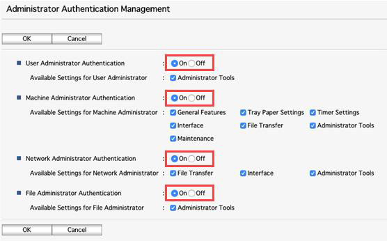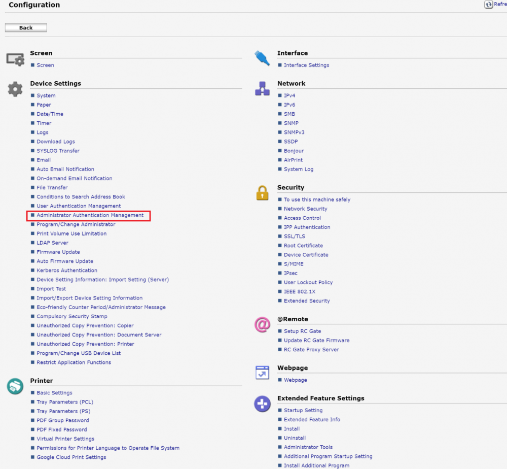 To maximize the device’s security and prevent users logging in via SAFEQ Cloud Embedded App accessing Administrator’s functions, login to the device’s web page and go to Device Management > Configuration > Administrator Authentication Management