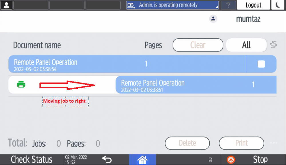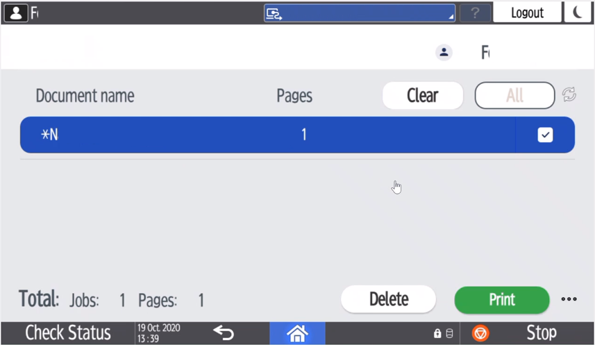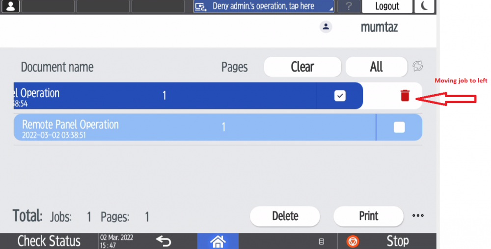 To delete or print a document, the corresponding buttons can be pressed. To delete the documents in the joblist, they can be flung left: