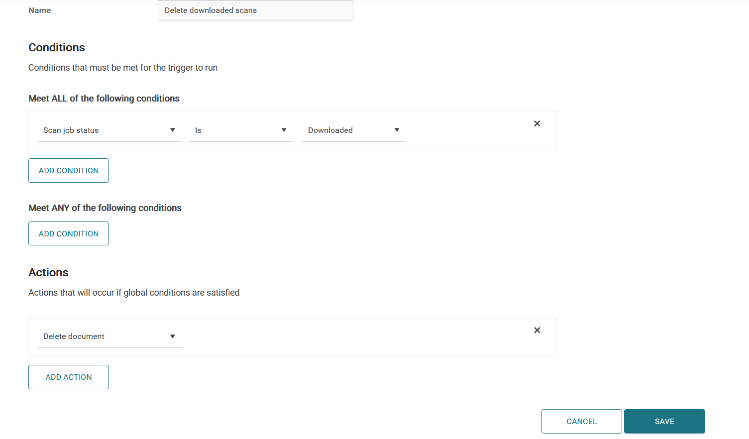 Note that some default rules, such as Delete expired scan jobs, cannot be deleted or edited.