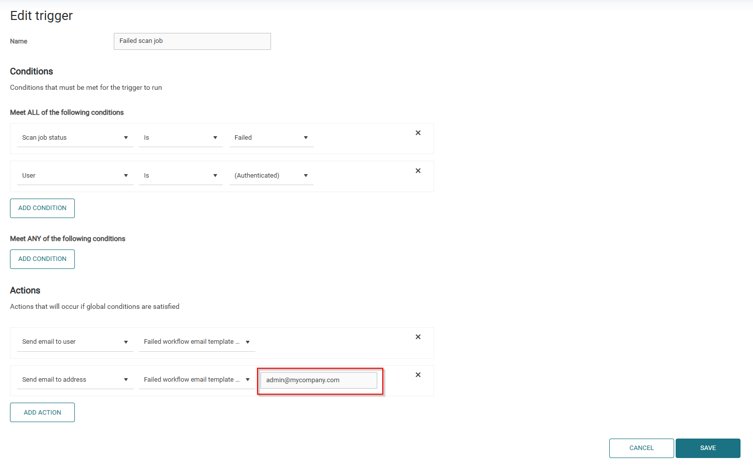 Failed workflow – This trigger activates when a scan job hasn't been successfully delivered. For this trigger to function correctly, you must set the email address of the admin user in the trigger actions.