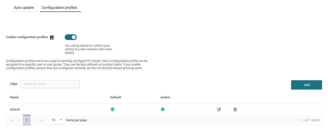 On the initial screen you can see a list of current profiles and whether the profile is active and marked as default. You can also edit/delete profiles and enable/disable configuration profiles altogether. Enabling/Disabling configuration profiles requires confirmation in the form of a pop-up window.