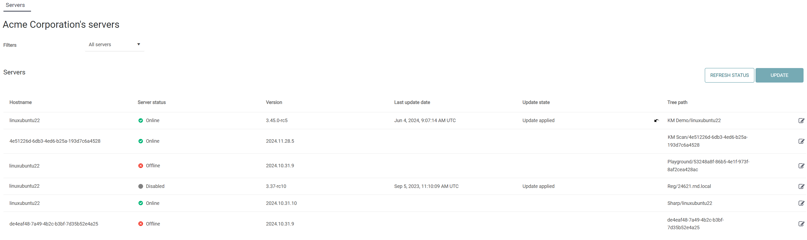Use this feature to see a list of all the account servers, their status, last update state and to perform remote server updates.