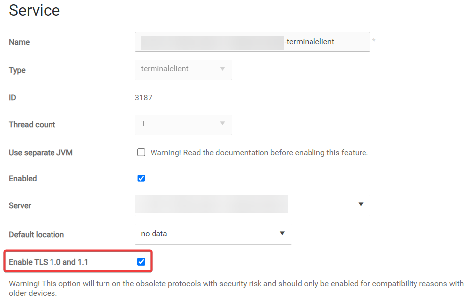 By default, SAFEQ Cloud uses TLS 1.3 for all communication. If SAFEQ Cloud can't communicate with an endpoint (such as an MFD) via TLS 1.3, it will fall back to TLS 1.2. If the endpoint doesn't support TLS 1.2 (as some older MFDs don't) and you have selected the Enable TLS 1.0 and 1.1 option in the terminalclient service, SAFEQ Cloud will also try TLS 1.1, and (if required) TLS 1.0.