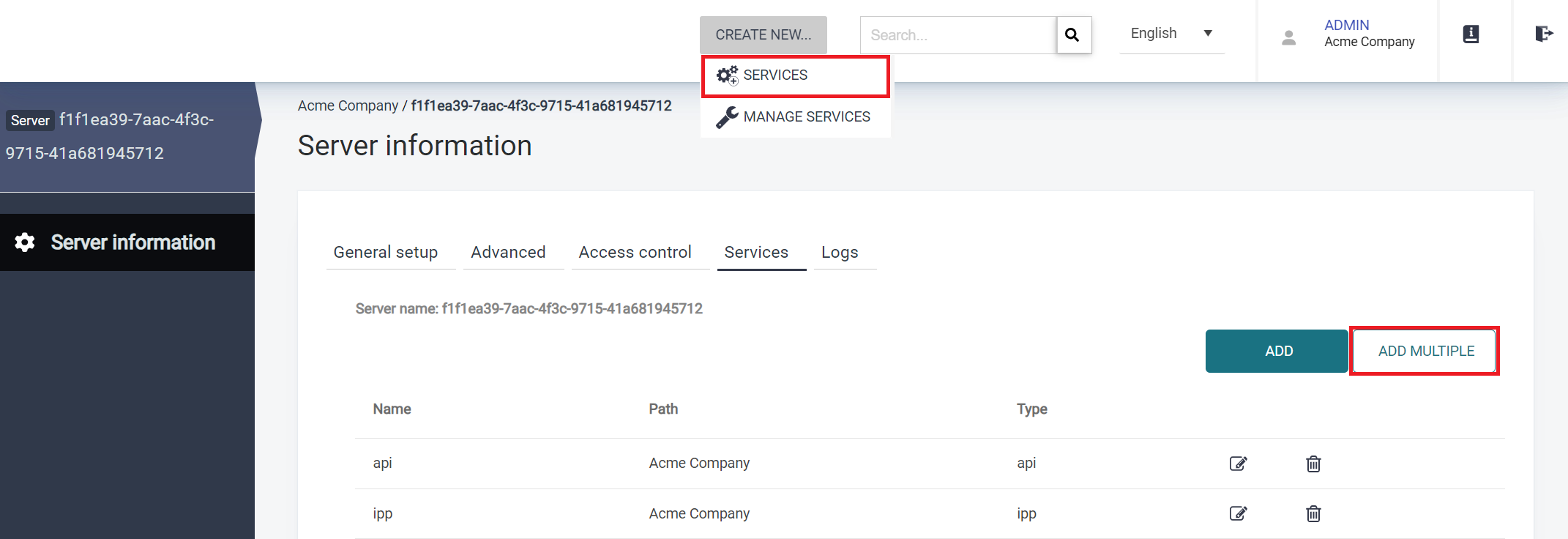 To add and remove multiple services, click Create new > Services or click Add multiple.
