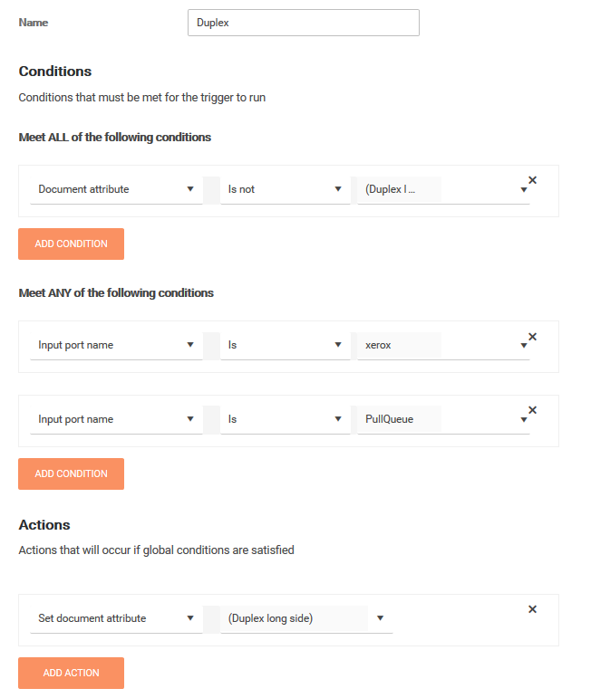 Example of trigger that sets all jobs pull and xerox printer to be printed duplex: