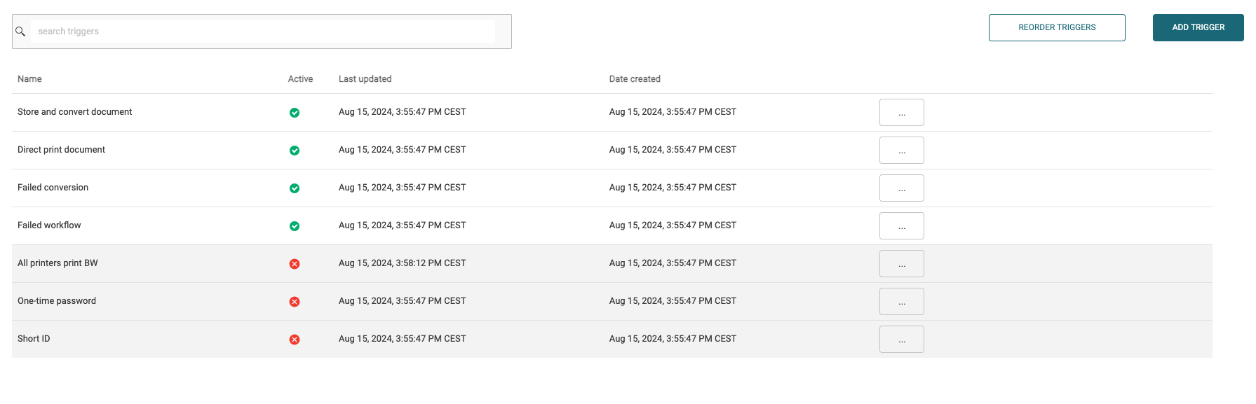 Rules run in a sequential cycle. Certain rules will have actions that change parameters used as conditions in other rules. To achieve the expected outcome, it is therefore important to consider the order by which rules are run. Inactive triggers are always displayed at the bottom of the table, where their order doesn't matter. Only the order of the active triggers is taken into account.