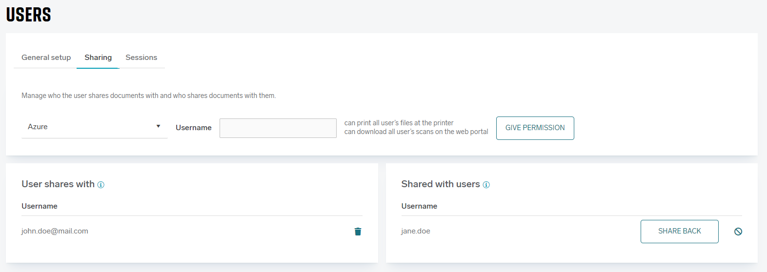 You can add users with whom you want the edited user to share their documents by selecting authentication provider, typing username and clicking on Give permission button.