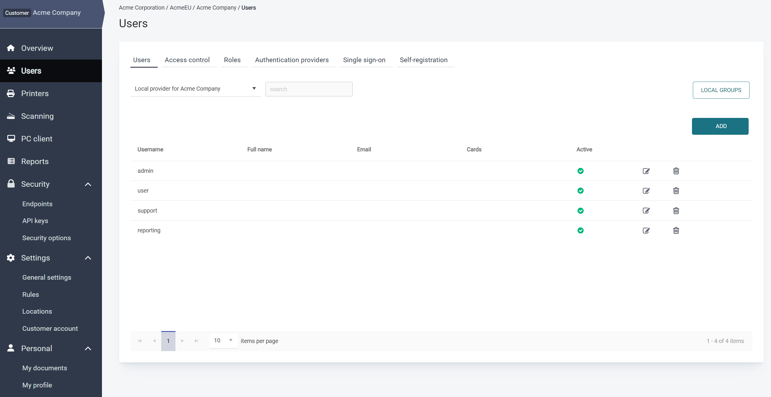 In the Users menu, you can configure Users, Access control, Roles, Authentication providers, Single sign-on and Self-registration.