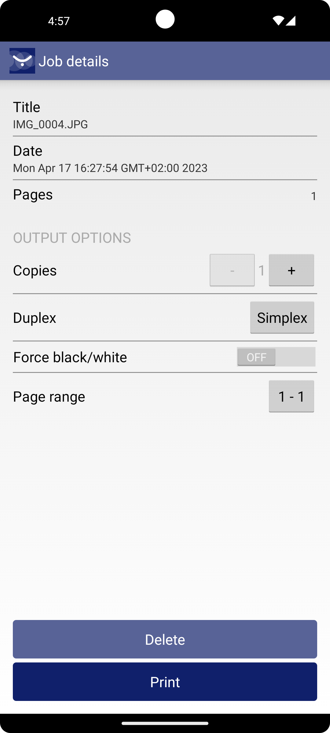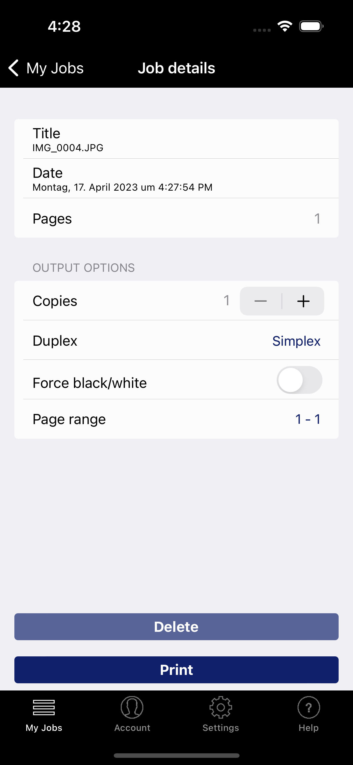 Tap the document you wish to print. The job details will be displayed. Tap Print.