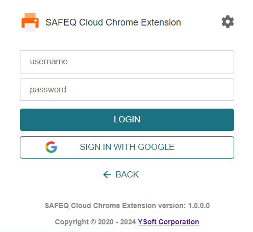 Click Log in. A login dialogue window will open. You will have a choice to log in with SAFEQ Cloud username and password or with your Google account.