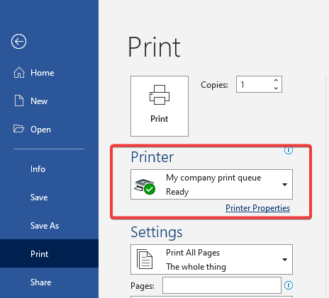 Example: printing from MS Word: