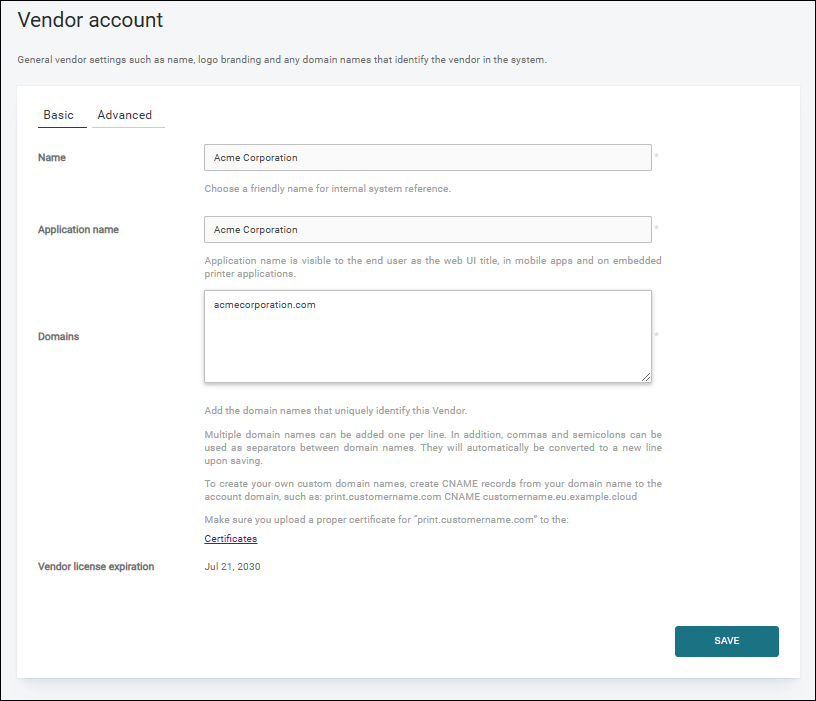 Each Vendor primary account, Customer primary account, or standard Account in the YSoft SAFEQ Cloud system tree has a Settings > Vendor account or Customer account menu item. It holds the general settings for the entity in the system, such as Name, logo branding, and any domain names that identify their system in the SAFEQ Cloud.