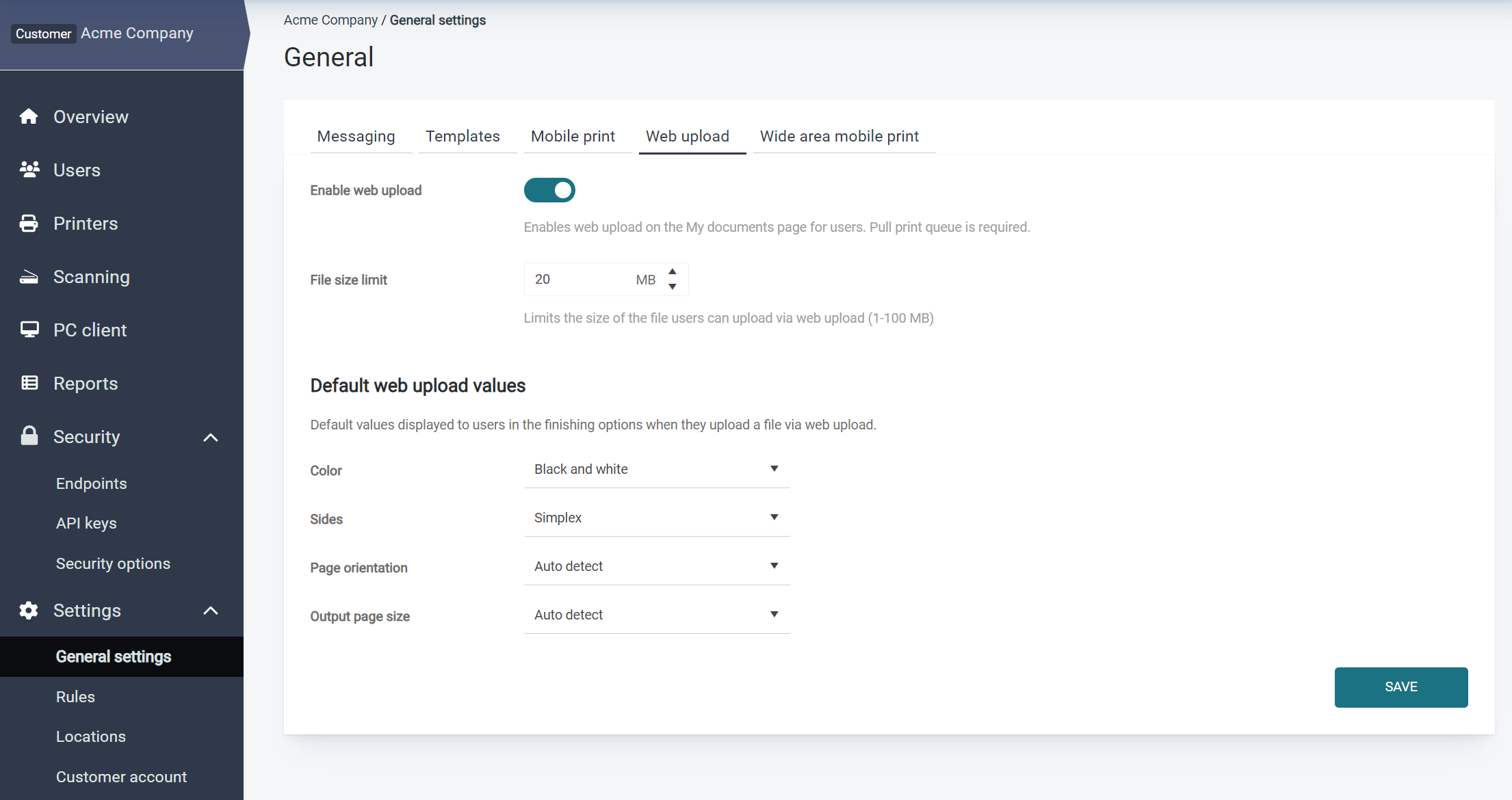On this tab in Settings > General settings, you can enable and configure the document upload functionality. Users can then use this functionality to upload documents for print at Personal > My documents page.