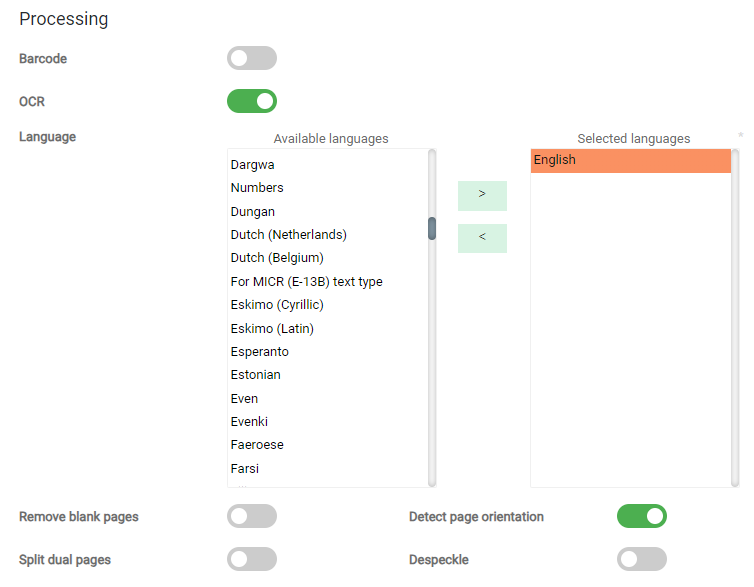 Language – Document languages. OCR processing requires the language setting to recognize the document's text correctly. You can select multiple languages.