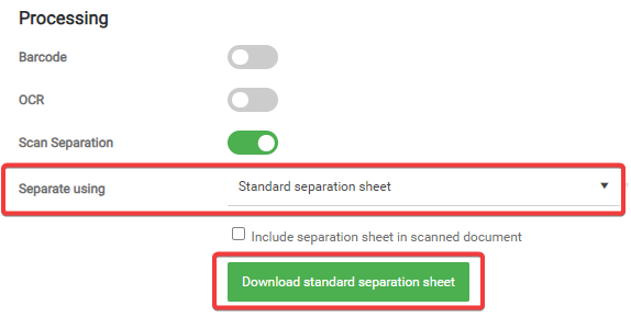 By default, the standard separation sheet is not included in the scan job. You can enable this by selecting the Include separation sheet in scanned document option.