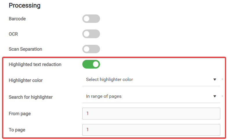 Highlighted text redaction - use the highlighter redaction step to redact (overlay with black) areas in a scanned document marked with the given color.