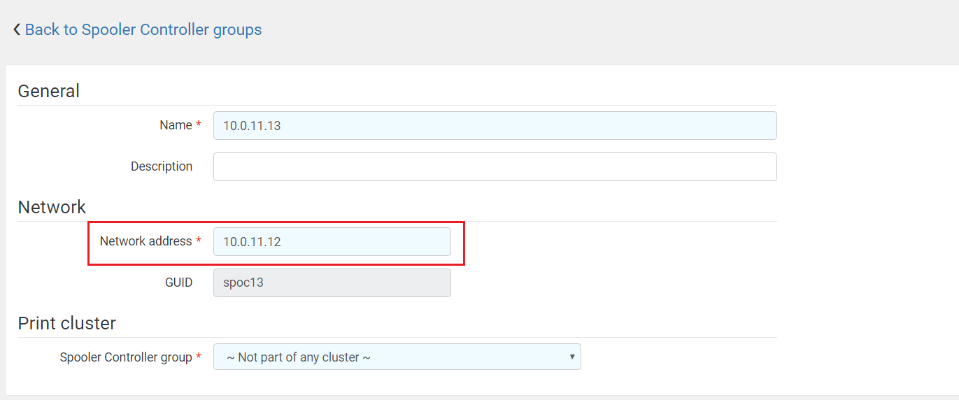 If a SPOC on the server with the new IP address is part of a Spooler controller group, then the SPOC cache must be deleted and the whole SPOC group must be restarted.