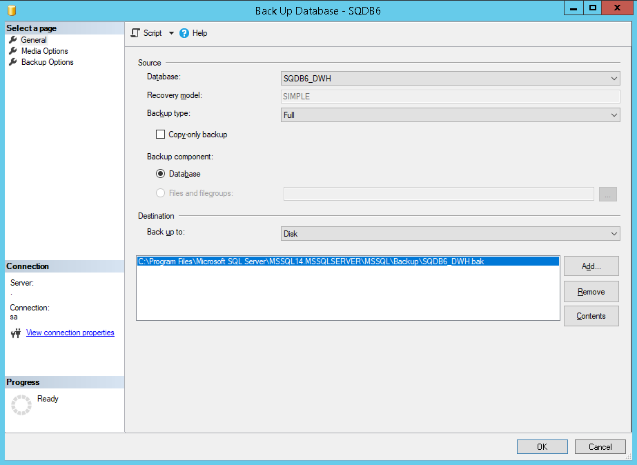 - Right-click the SQDB6_DWH database and select the Tasks > Back up ... option