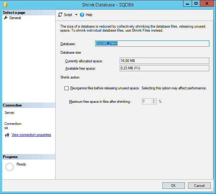- Right-click the SQDB6_DWH database and select the Tasks > Shrink > Database ... option and proceed using OK button