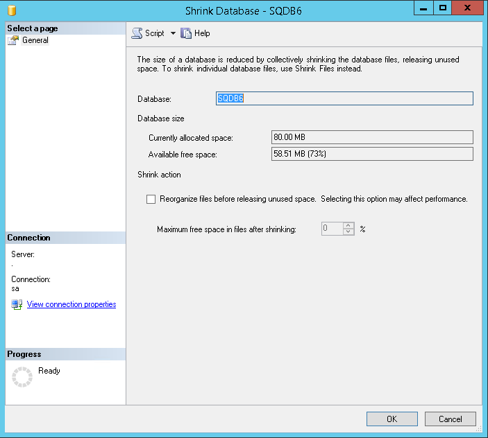 - Right-click the SQDB6 database and select the Tasks > Shrink > Database ... option and proceed using OK button