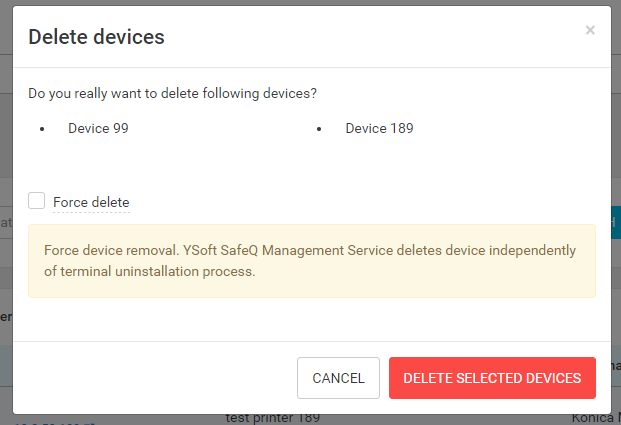 Batch deletion works analogically to a single device deletion – when deletion is not forced, the Embedded terminal deletion progress page is shown to the administrator so they can track the progress of deletion of all devices with the terminal (devices without the terminal are deleted immediately).The "Force delete" checkbox is shown only if the system detects that the device was previously unsuccessfully deleted.
