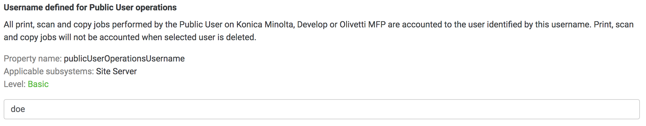 - All print, scan, copy and fax jobs will be accounted under the user specified in the system settings under publicUserOperationsUsername property.